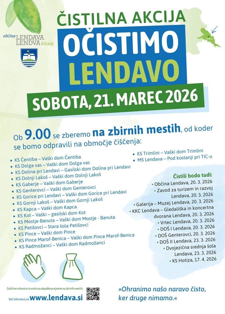 Občina Lendava bo v soboto, 21. marca 2026, ob Svetovnem dnevu voda organizirala tradicionalno čistilno akcijo. Pobuda bo potekala v sodelovanju s krajevnimi skupnostmi, društvi in javnimi zavodi, njen namen pa je prispevati k čistejšemu in bolj urejenemu okolju ter spodbuditi odgovoren odnos do narave in skupnega življenjskega prostora.