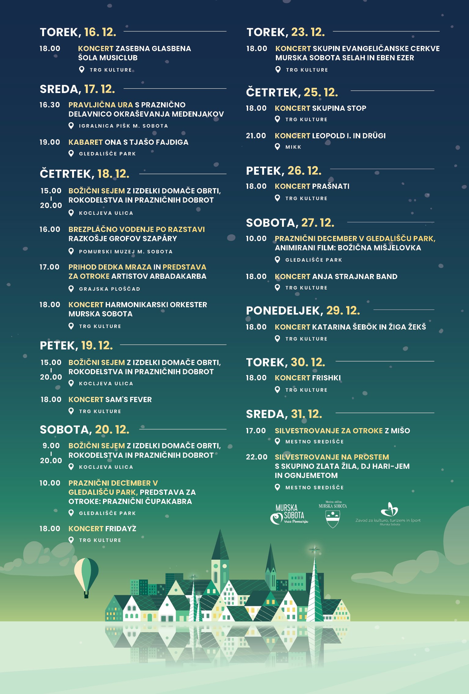 Torek, 23. december – Selah in Eben Ezer ( Zaradi dežja bo koncert glasbenih skupin Evangeličanske cerkve Murska Sobota Selah in Eben Ezer, namesto ob drsališču, v Evangeličanski cerkvi Murska Sobota)